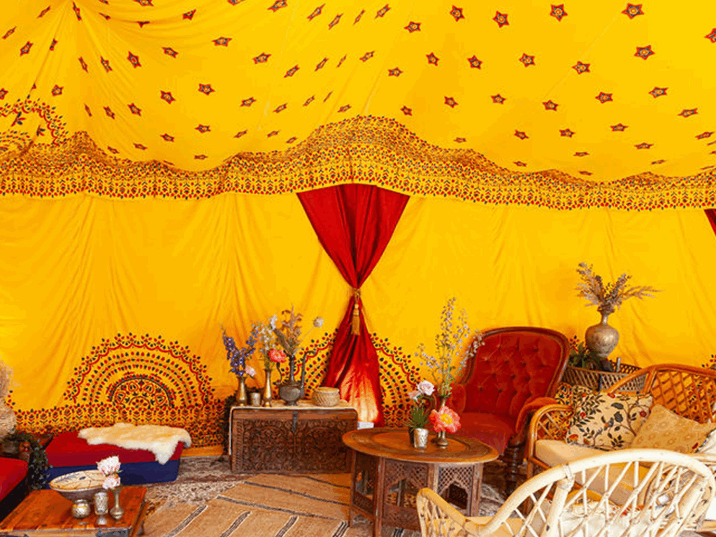 Our saffron yellow marquee has always been a popular choice for lounge areas, VIP spa areas at festivals and chillout spaces at parties for these reasons. You may have seen it at WOMAD.