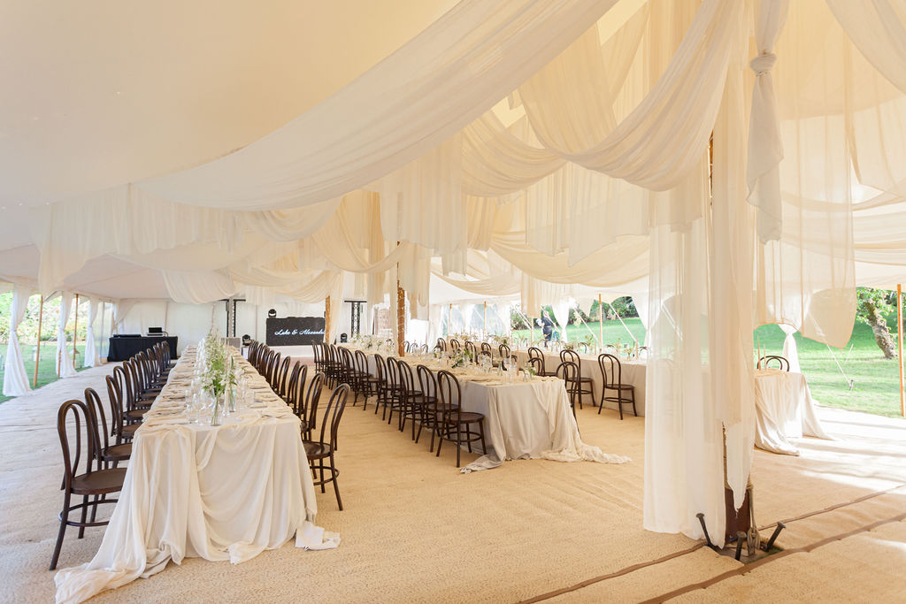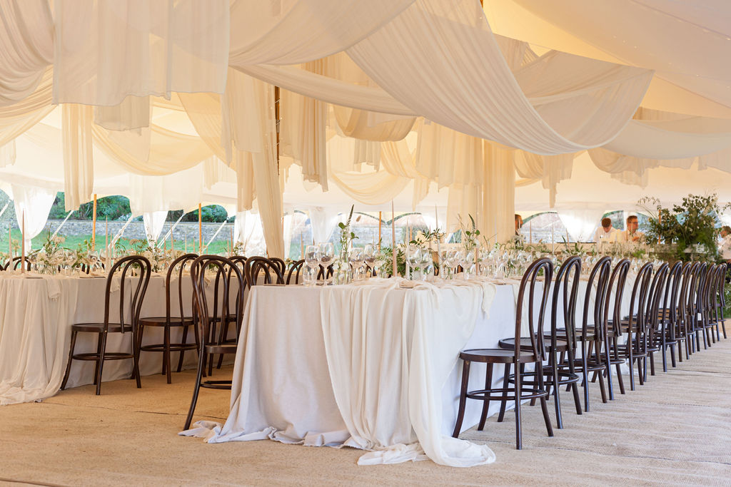 Our Cornish Cream marquee interior is one of our most popular wedding marquees. It is used often as a dining tent or for the entire wedding reception space as it’s so versatile.