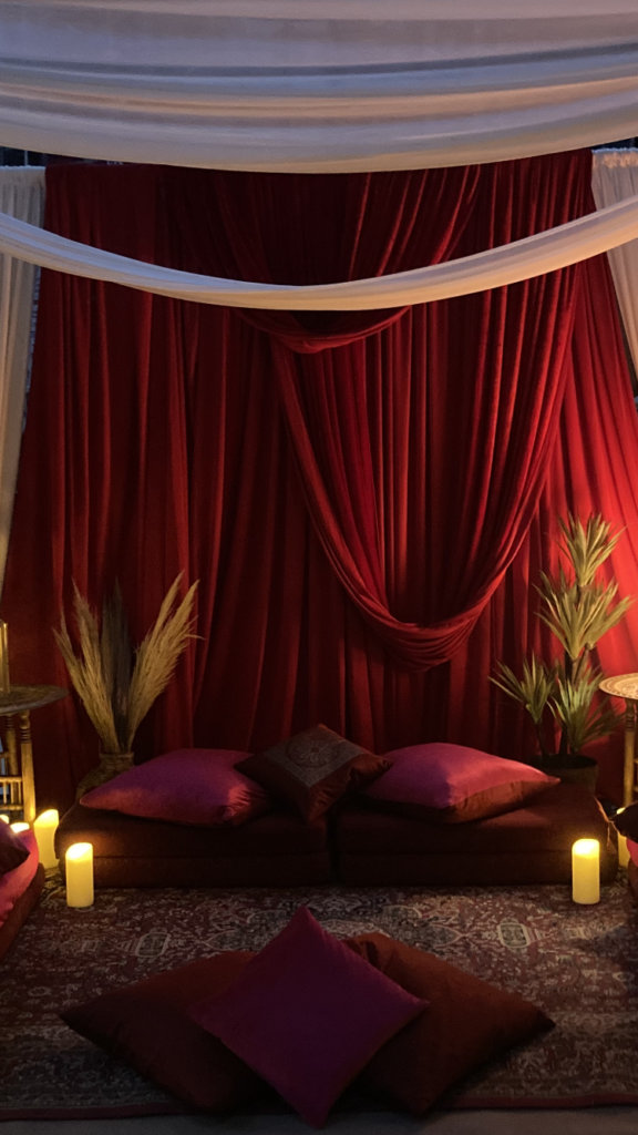 Red drapes can be used to decorate any space, a marquee, a venue or home to create a soft and mysterious feeling as demonstrated below.