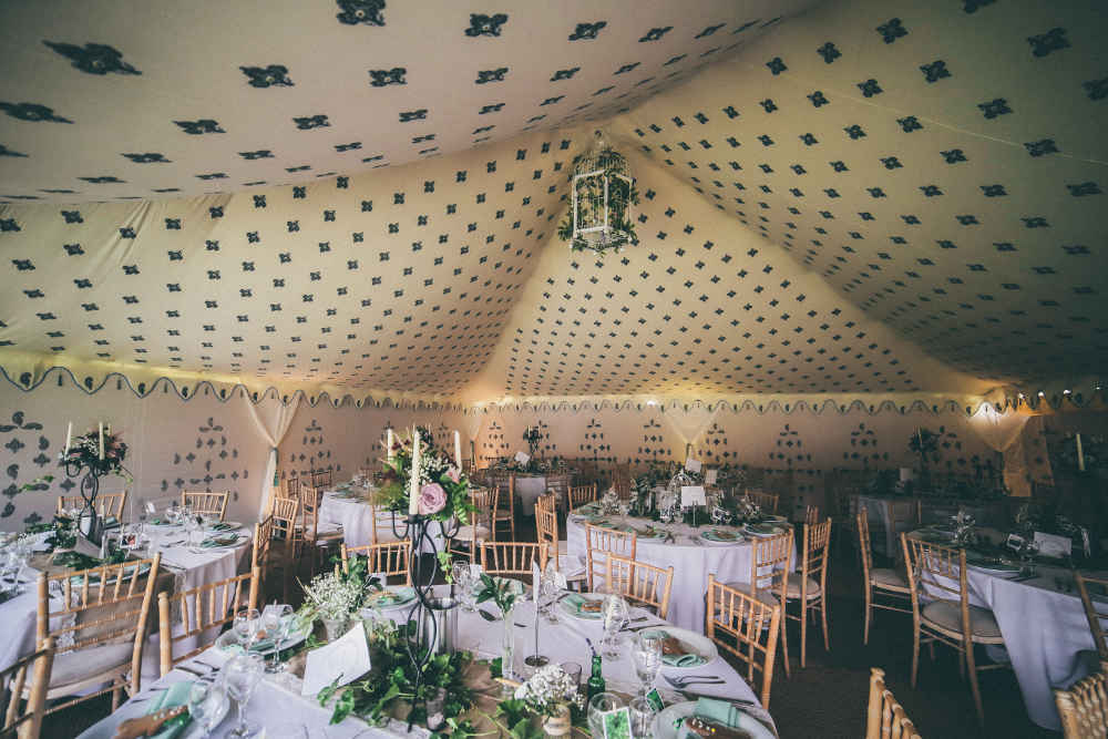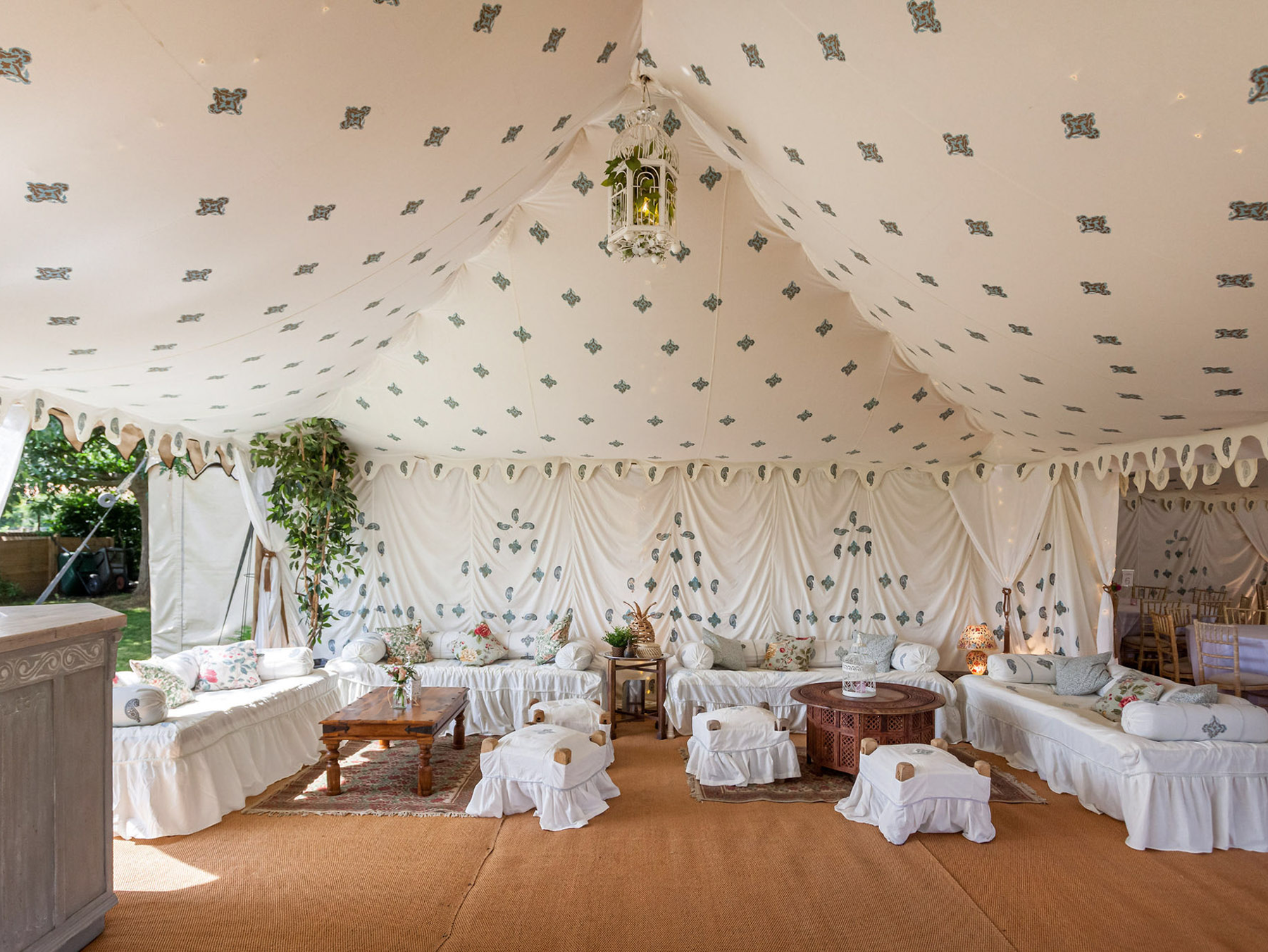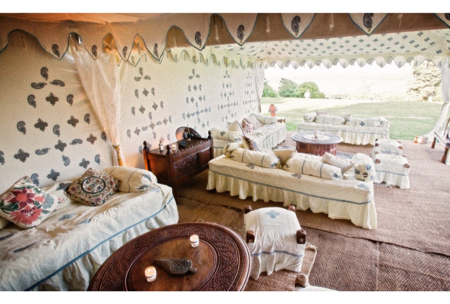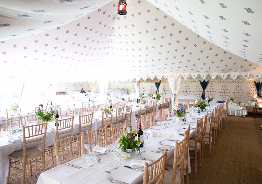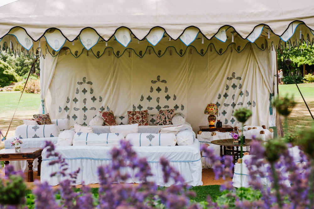 The fleur de lys inspired print in the ceiling is of a silvery-blue and gold design, with mirrors sewn into the centre. The walls feature a panel design including a ‘kiri’ block print which represents the peacock in Indian culture. As the breeze ripples the dreamy tent walls, the sun finds the tiny mirrors sewn into the linings making the whole tent glitter. This unique marquee is both light and airy by day, and warm and romantic by night.