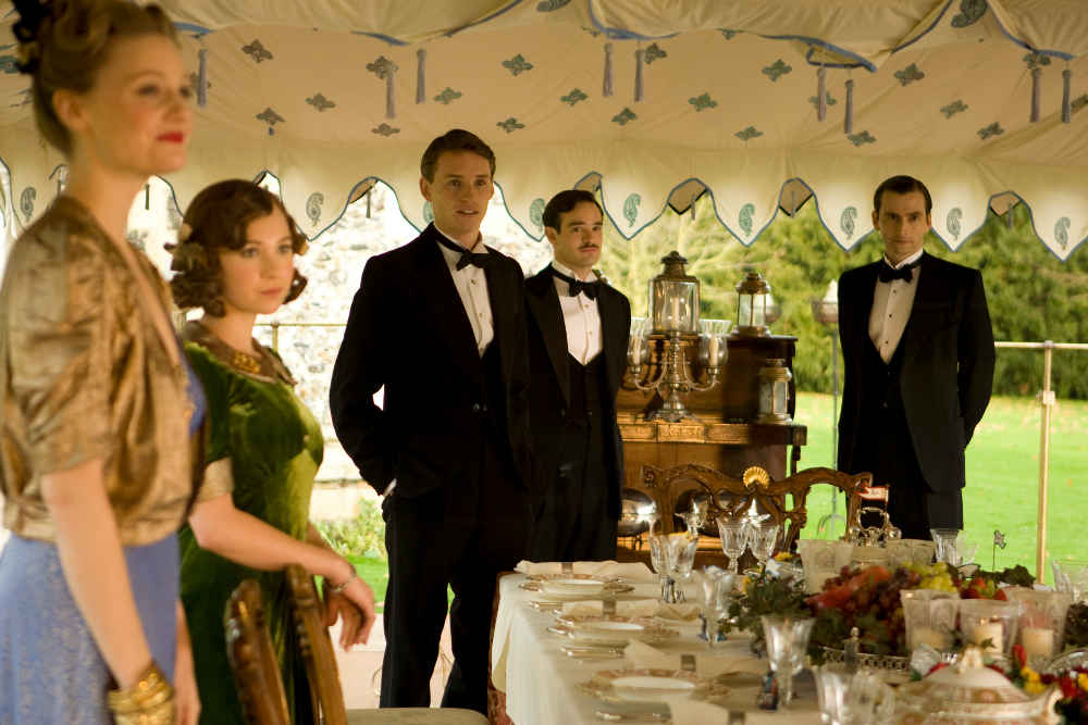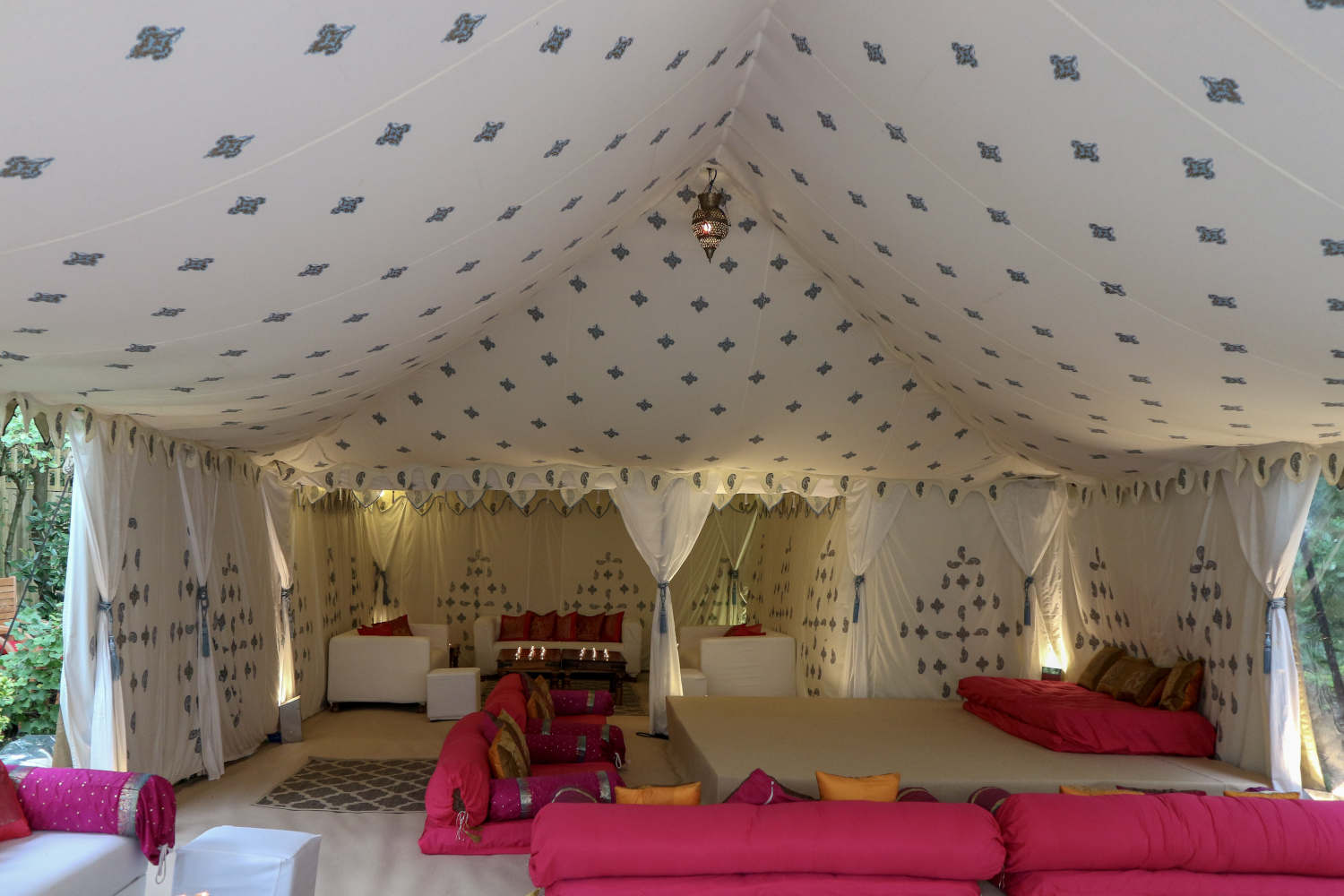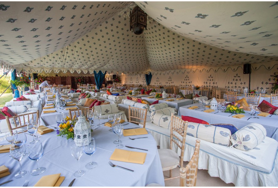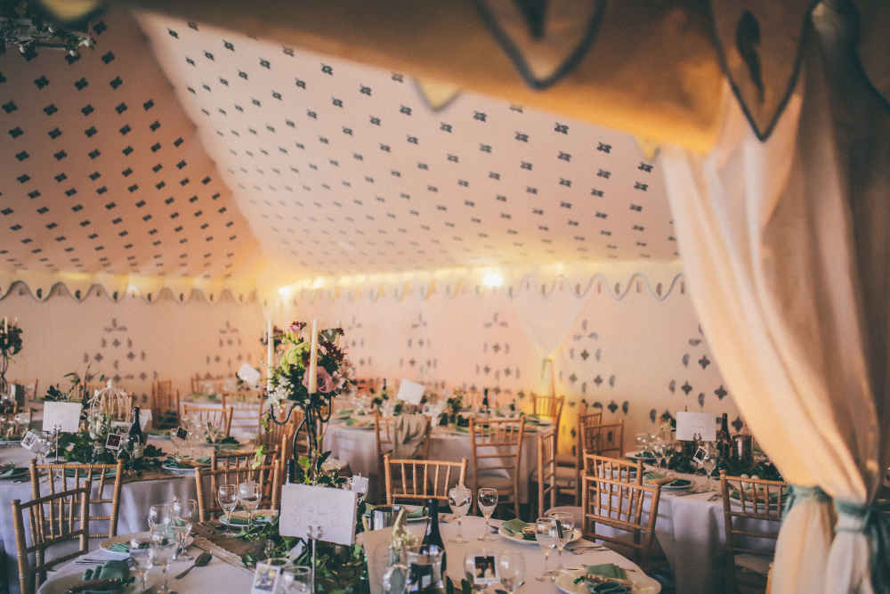 The fleur de lys inspired print in the ceiling is of a silvery-blue and gold design, with mirrors sewn into the centre. The walls feature a panel design including a ‘kiri’ block print which represents the peacock in Indian culture. As the breeze ripples the dreamy tent walls, the sun finds the tiny mirrors sewn into the linings making the whole tent glitter. This unique marquee is both light and airy by day, and warm and romantic by night.
