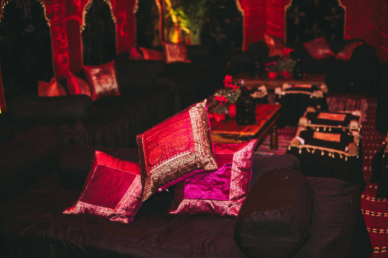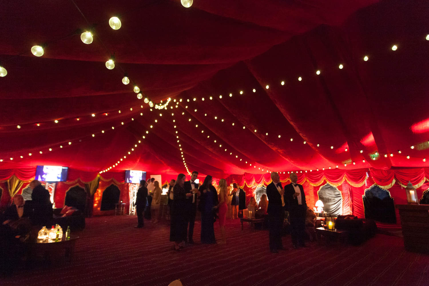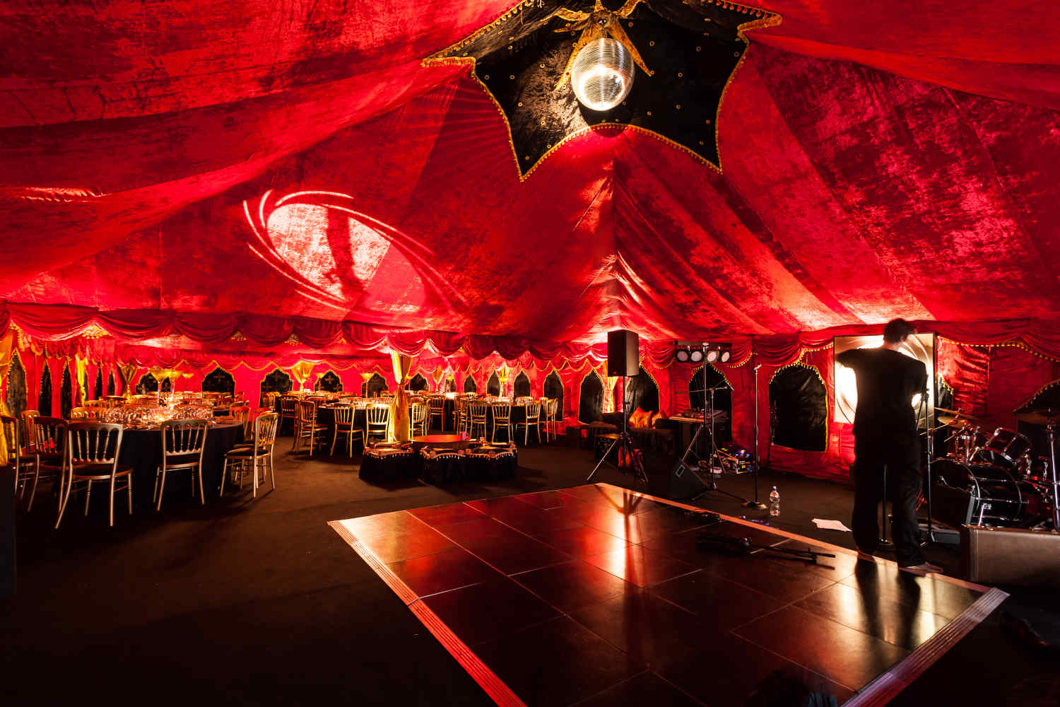The La Rouge interior was inspired by the famous French dance hall – Moulin Rouge – and was first introduced as a popular casino-style festival tent. The luscious red velvet creates depth and drama, while gold tassel-trimmed swags add a sense of sumptuousness. Arched wall panels adorned with intricate beading frame the space beautifully, and the soft, warm lighting bouncing off the linings enhances the marquee’s intense and moody atmosphere.