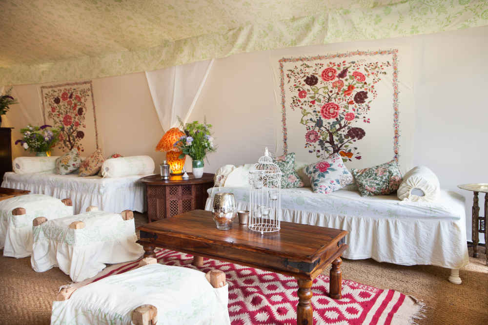A selection of beautiful pieces of furniture have been hand covered in his designs and are available to hire to complete the look including deck-chairs with William Morris prints, kashmiri hand embroidered cushions, chez lounges and of course cushions.