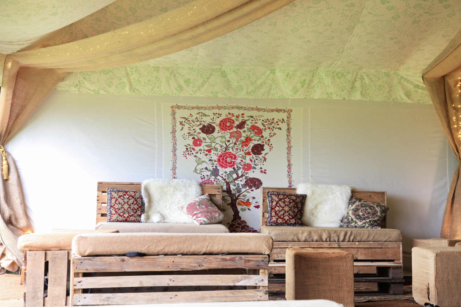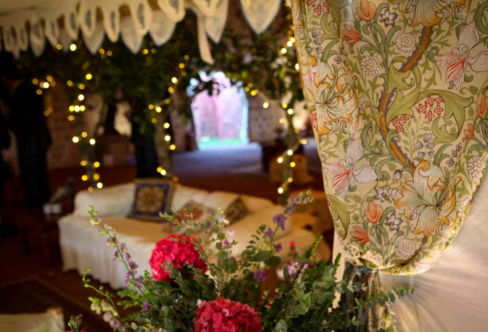 Our William Morris marquee is our Garden Room and was created as a homage to one of our favourite designers’ centenaries; William Morris. It was commissioned by The National Trust to use for the Centenary of the founding of Morris & Co. William Morris was part of the Arts and Crafts movement of the 1930’s and spent much time studying the Islamic collection at the V&A museum where his famous floral patterns were inspired. Our ivory and sage green screen-printed ceiling lining provides a backdrop on it’s own, or can be combined with light cotton voile swags in the print ‘Golden Lilies’ as an additional detail.
