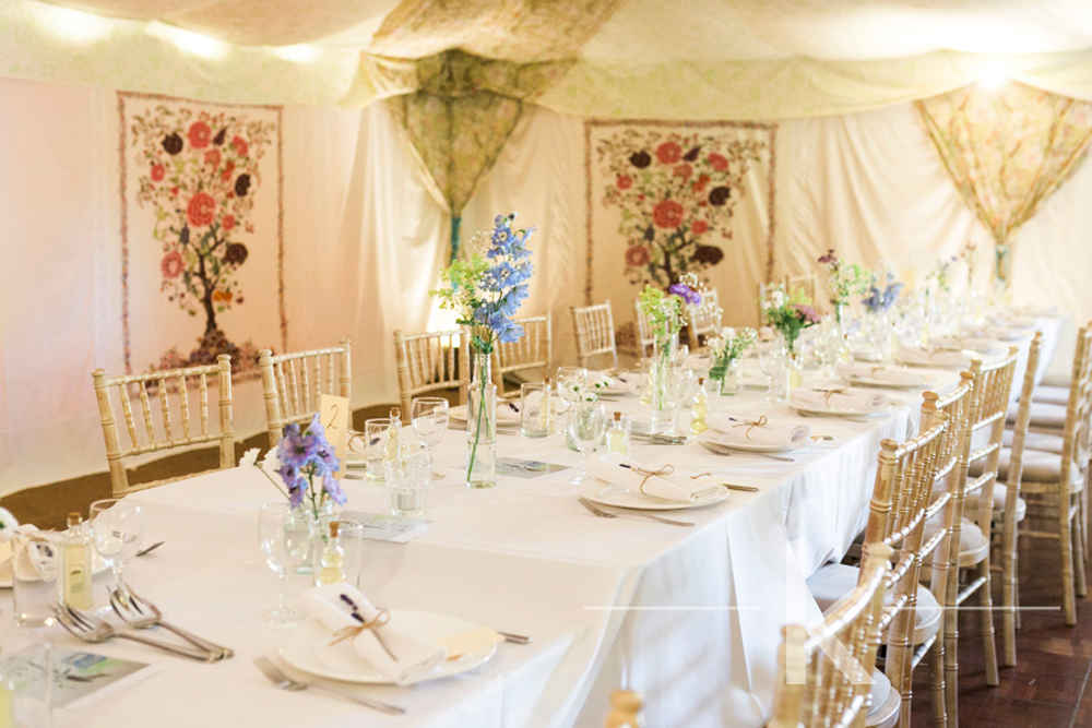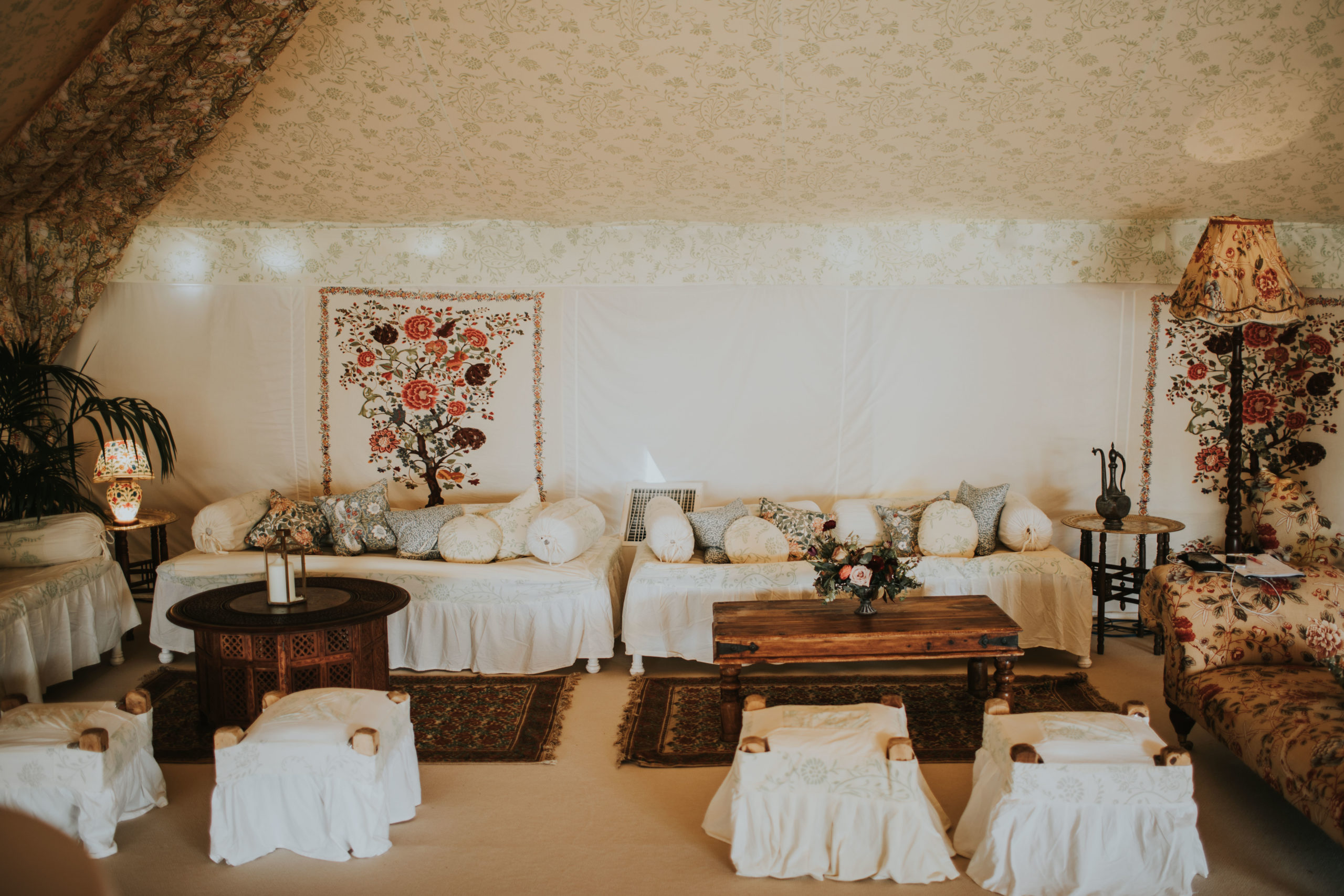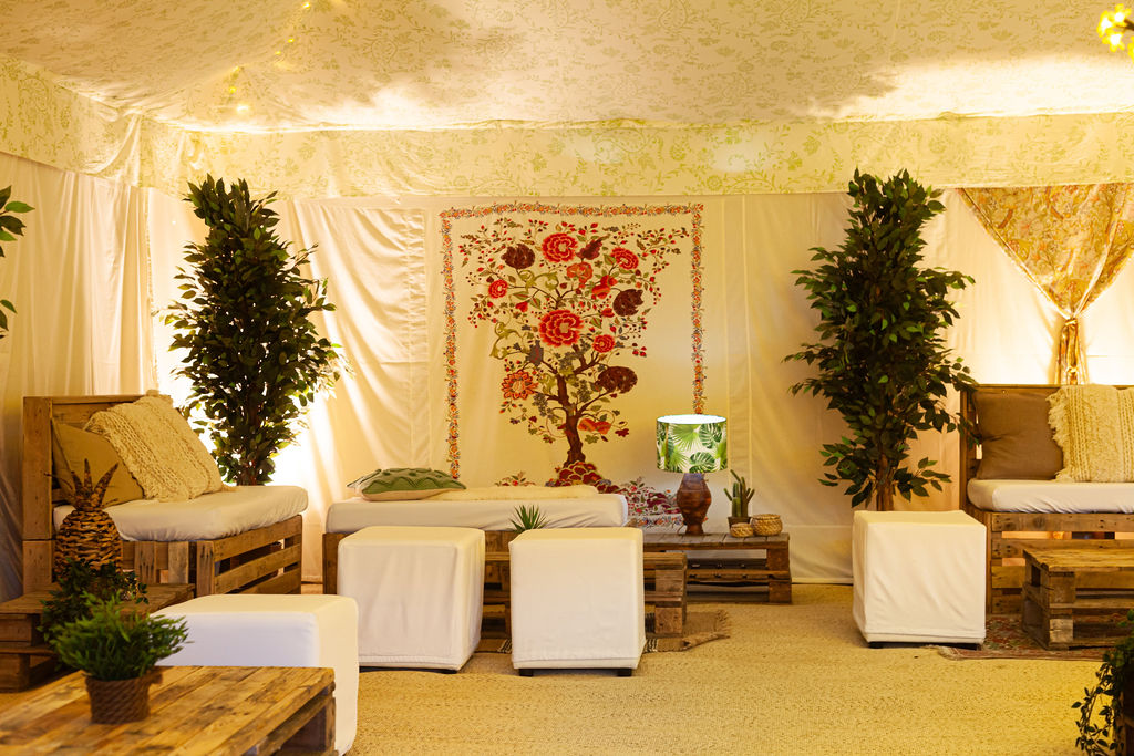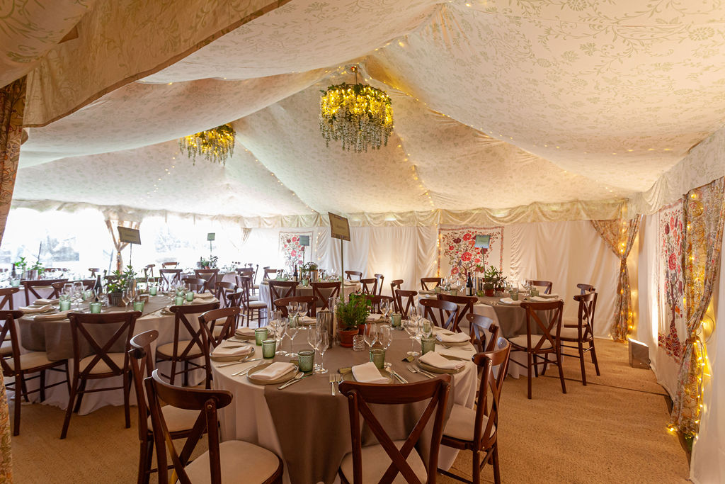 The walls have a Morris-inspired ‘Tree of Life’ design that is a painstakingly created 12 colour screen-print. The William Morris tent is a quintessentially English tent interior and ‘English Country Garden’ look, perfect for unique marquee weddings and summer garden parties. It proved a popular option for Micro Weddings in 2020 due to it’s flexibility in size.