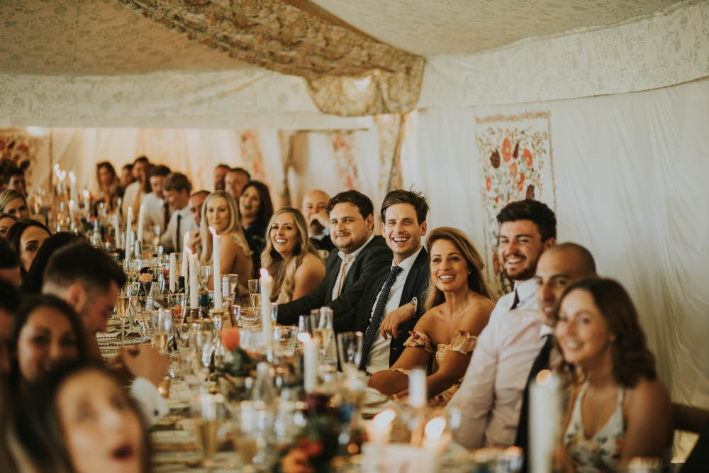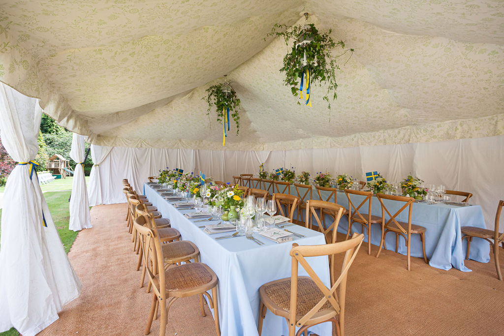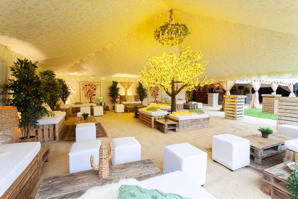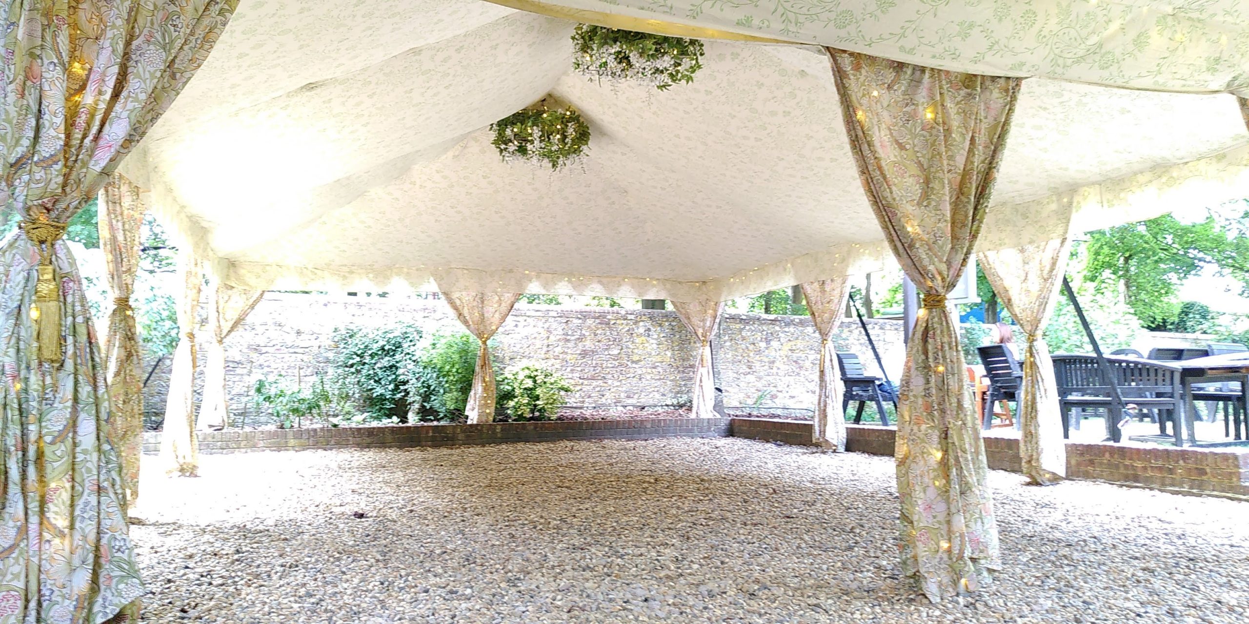 The walls have a Morris-inspired ‘Tree of Life’ design that is a painstakingly created 12 colour screen-print. The William Morris tent is a quintessentially English tent interior and ‘English Country Garden’ look, perfect for unique marquee weddings and summer garden parties. It proved a popular option for Micro Weddings in 2020 due to it’s flexibility in size.